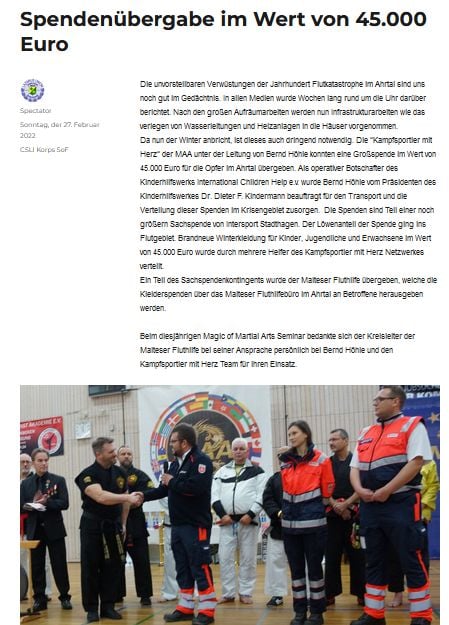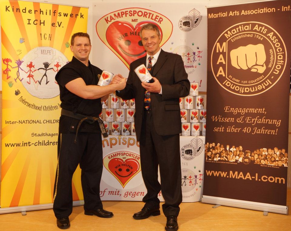 Die MAA Initiative Kampfsportler mit Herz wurde durch Bernd Höhle ( MAA Präsident ) in kooperation mit dem Präsidenten des Kinderhilfswerk Internationat Children Help e.V. Generalkonsul aD. Dr. Dieter Kindermann gegründet und arbeiten Hand in Hand. Viel Geld wurde gespendet, Viele Großlieferrungen, LKW-Ladungen an Sachspenden wurden bewegt ins Ahrtal, Balkan-Flutgebiet, Urkraine und Rumainien. Krankenhäuser, Feuerwehren und Schulen in Afrika, Paraguay, Ukraine und den Philipinen wurden gebaut und bespendet. Mehrere Krankenwagen nach Afrika und Paraguay, der Bau von Unterkünften für 46 Familien in den Philippinen erbaut, Zahnarztpraxis für Paraguay, Medical Camps in Nepal und den Philippinen, Feeding-Programme und vieles mehr. Fluthilfe im Ahrtal, Kinderhospitz Löwenherz uvm. Anfang der Corona-Kriese konnte Höhle sogar 50.000 FFP2 Masken für den Katastrophenschutz beschaffen.. Die Kampfsportler mit Herz leisteten ehrenamtlich ( unendgeldlich ) über 6ooo Arbeitsstunden ( Anfahrt und Unterkunft selbstfinanziert ).