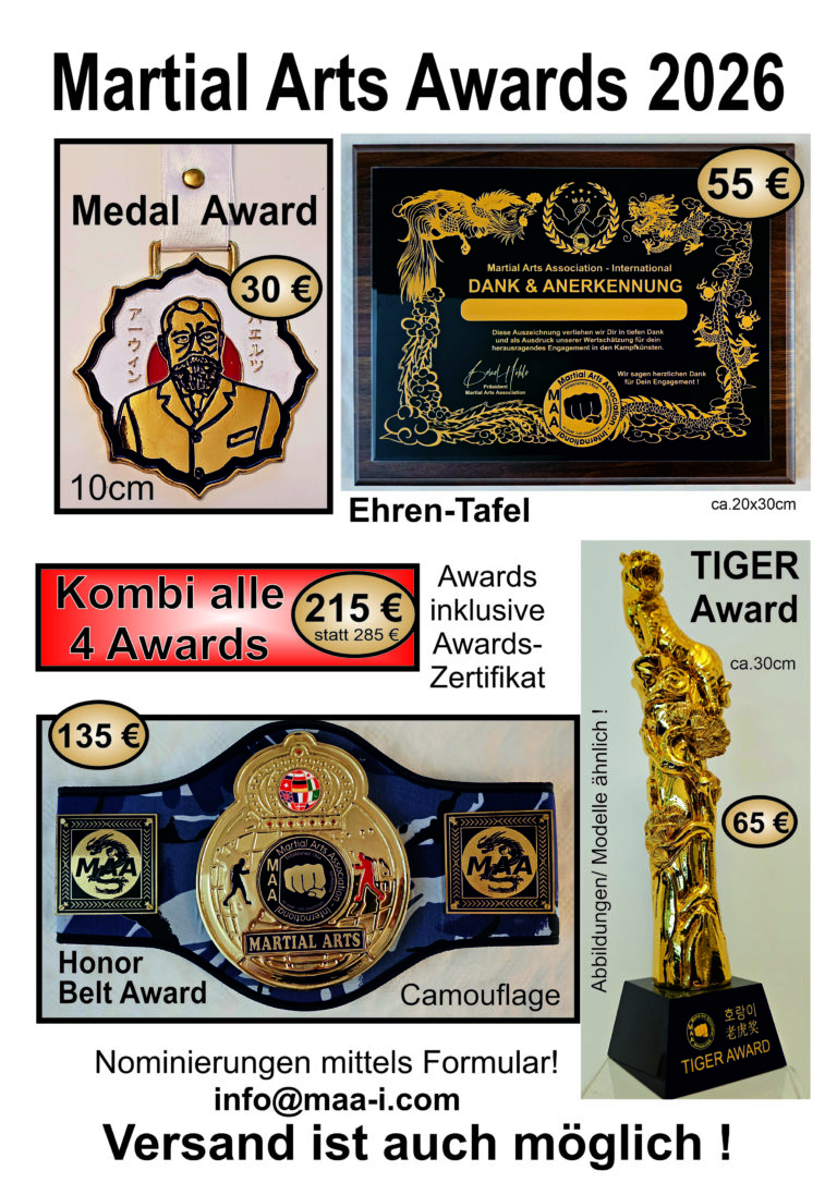 Für Ehrungen, die durch Empfehlung des Verein/ Club / Meister erfolgen gilt die Einhaltung der Budo-Ethik. „Ehre wem Ehre gebührt“! Im ermessen des Verein/ Club / Meister können hier, sich verdient gemachte Personen ausgezeichnet werden, als Dank oder Anerkennung für besondere Leistungen. Meister, Trainer, Assistenztrainer, Wettkämpfer, Sozial-Engagierte, Helfer und Betreuer, besondere Projekte, Sponsoren etc. also auch die „Stillen Stars“ im Hintergrund sind hier gemeint.