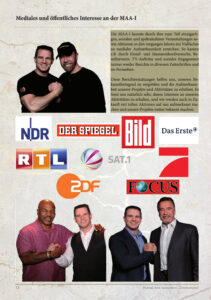 Neben regelmäßigen Großberichten und Veröffentlichungen in Fachsportzeitschriften, Sportillustrierten und renommierten Großzeitungen ist die MAA-I bereits schon oft im Fernsehen und Radio erschienen bzw. repräsentiert worden. Weiterhin präsentieren wir uns auf Fachmessen, Kongressen und auch bei der Expo waren wir dabei. Etliche MAA-I Mitglieder haben zudem auch in Kinofilmen, TV Filmen & Serien mitgespielt.