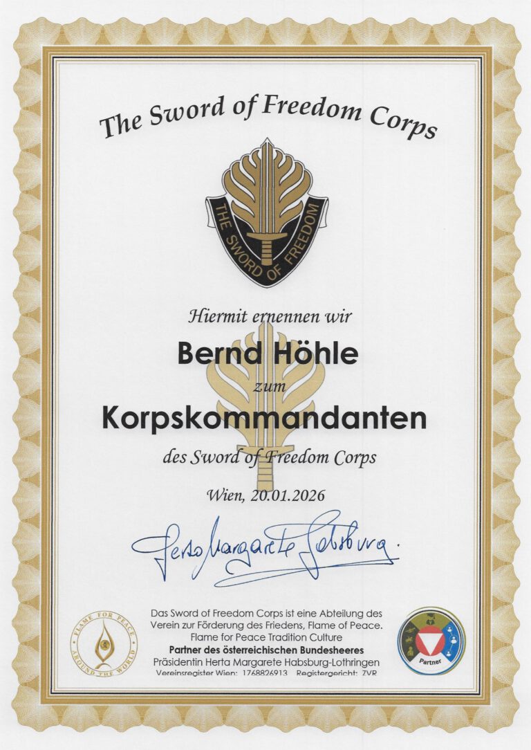 The Sword of Freedom – Corps (SOF-Corps) ist eine international tätige, operative Abteilung des Vereins „Flamme des Friedens – Verein zur Förderung des Friedens e.V. ( Flame of Peace Tradition & Culture)“, einer Organisation, die sich weltweit für Frieden, Humanität, soziale Gerechtigkeit, kulturelle Verständigung und nachhaltige Entwicklung einsetzt. Der Verein zur Förderung des Friedens e.V. ist offizieller Partner des Österreichischen Bundesheeres. Innerhalb dieser Struktur fungiert das SOF-Corps als praxisorientierte Einsatz- und Projektplattform, die ideelle Ziele in konkrete Maßnahmen überführt. Während der Dachverband vor allem repräsentative, diplomatische und kulturelle Initiativen fördert, übernimmt das SOF-Corps die Rolle einer handlungsfähigen Einheit für humanitäre, soziale, pädagogische und sicherheitsrelevante Aufgabenfelder.