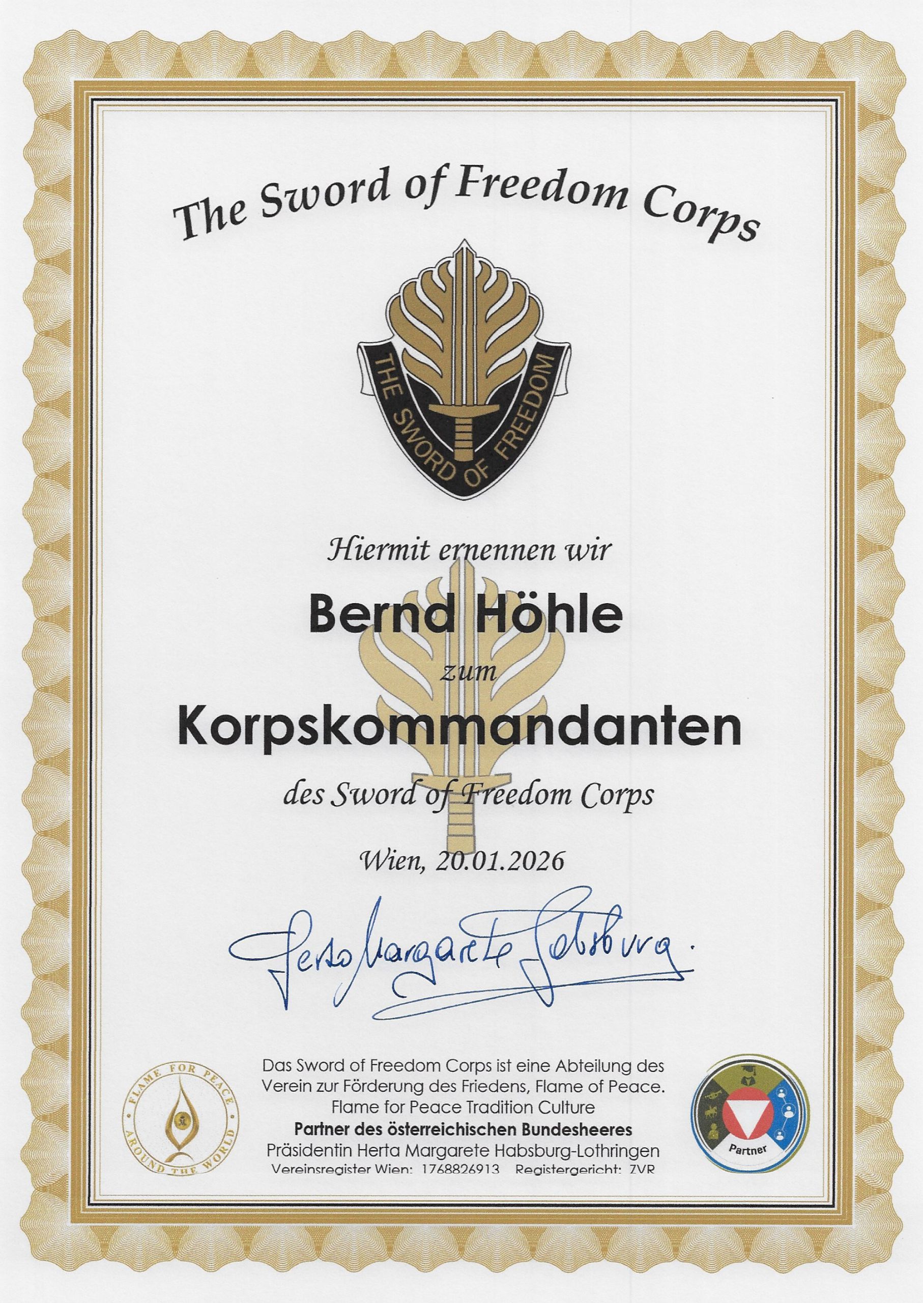 The Sword of Freedom – Corps (SOF-Corps) ist eine international tätige, operative Abteilung des Vereins „Flamme des Friedens – Verein zur Förderung des Friedens e.V. ( Flame of Peace Tradition & Culture)“, einer Organisation, die sich weltweit für Frieden, Humanität, soziale Gerechtigkeit, kulturelle Verständigung und nachhaltige Entwicklung einsetzt. Der Verein zur Förderung des Friedens e.V. ist offizieller Partner des Österreichischen Bundesheeres. Innerhalb dieser Struktur fungiert das SOF-Corps als praxisorientierte Einsatz- und Projektplattform, die ideelle Ziele in konkrete Maßnahmen überführt. Während der Dachverband vor allem repräsentative, diplomatische und kulturelle Initiativen fördert, übernimmt das SOF-Corps die Rolle einer handlungsfähigen Einheit für humanitäre, soziale, pädagogische und sicherheitsrelevante Aufgabenfelder.